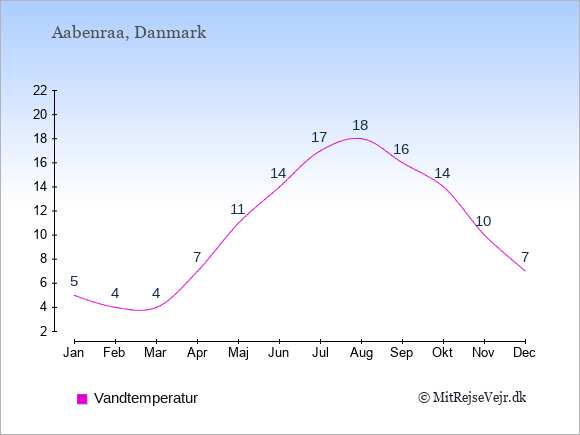 Graferne viser de gennemsnitlige maksimale temperaturer i Aabenraa og København (typisk når solen står højest på himmelen om eftermiddagen) og de gennemsnitlige minimale temperaturer (typisk den laveste temperatur som måles om natten).