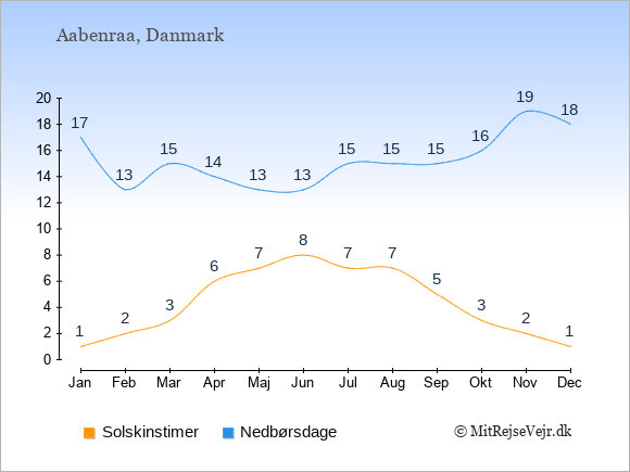 Graferne viser det gennemsnitlige antal solskinstimer i Aabenraa pr. dag samt det gennemsnitlige antal dage med nedbør i Aabenraa sammenlignet med København.