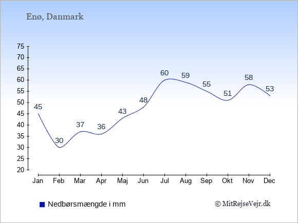 Her på siden kan du få et samlet overblik over det gennemsnitlige klima på Enø måned for måned sammenlignet med klimaet i København. Oplysningerne om det historiske klima kan du bruge til at planlægge din ferie og finde det bedste tidspunkt at rejse på.