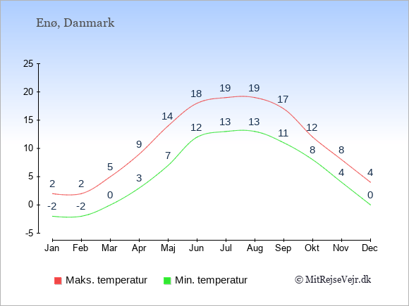Graferne viser de gennemsnitlige maksimale temperaturer på Enø og i København (typisk når solen står højest på himmelen om eftermiddagen) og de gennemsnitlige minimale temperaturer (typisk den laveste temperatur som måles om natten).