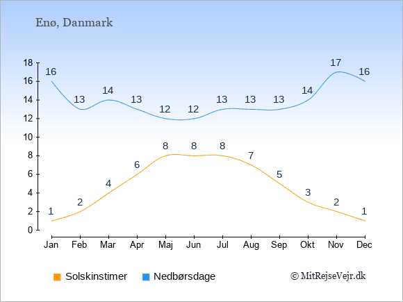 Graferne viser det gennemsnitlige antal solskinstimer på Enø pr. dag samt det gennemsnitlige antal dage med nedbør på Enø sammenlignet med København.