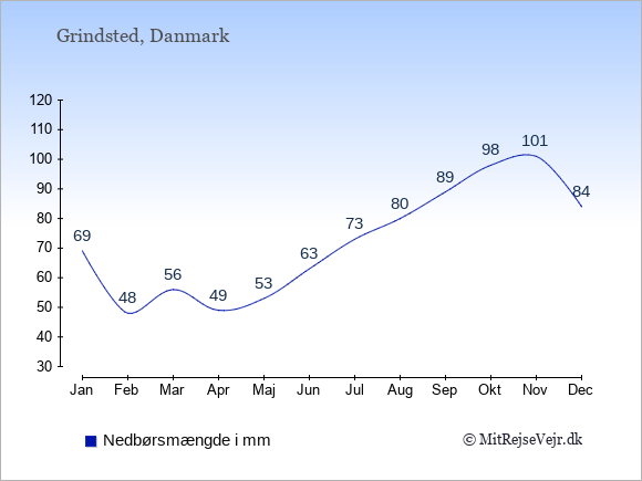 Skal man ud og rejse, har Grindsted det bedste klima i de måneder, hvor der er mange solskinstimer og få nedbørsdage.