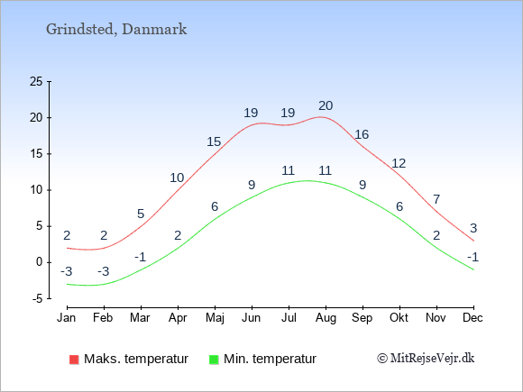 Graferne viser de gennemsnitlige maksimale temperaturer i Grindsted og København (typisk når solen står højest på himmelen om eftermiddagen) og de gennemsnitlige minimale temperaturer (typisk den laveste temperatur som måles om natten).