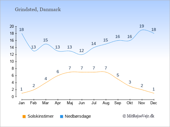 Graferne viser det gennemsnitlige antal solskinstimer i Grindsted pr. dag samt det gennemsnitlige antal dage med nedbør i Grindsted sammenlignet med København.