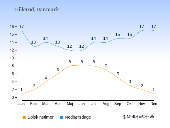 Graferne viser det gennemsnitlige antal solskinstimer i Hillerød pr. dag samt det gennemsnitlige antal dage med nedbør i Hillerød sammenlignet med København.