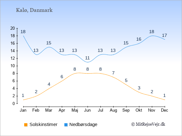 Graferne viser det gennemsnitlige antal solskinstimer i Kalø pr. dag samt det gennemsnitlige antal dage med nedbør i Kalø sammenlignet med København.