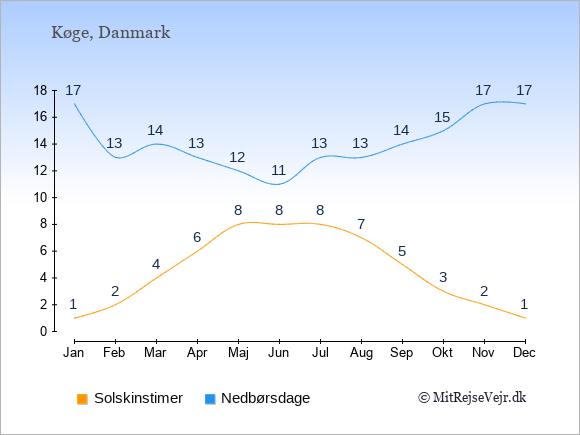 Graferne viser det gennemsnitlige antal solskinstimer i Køge pr. dag samt det gennemsnitlige antal dage med nedbør i Køge sammenlignet med København.