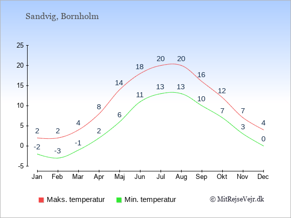 Graferne viser de gennemsnitlige maksimale temperaturer i Sandvig og København (typisk når solen står højest på himmelen om eftermiddagen) og de gennemsnitlige minimale temperaturer (typisk den laveste temperatur som måles om natten).