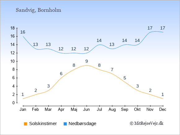Graferne viser det gennemsnitlige antal solskinstimer i Sandvig pr. dag samt det gennemsnitlige antal dage med nedbør i Sandvig sammenlignet med København.