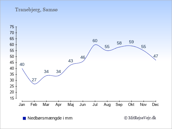 Her på siden kan du få et samlet overblik over det gennemsnitlige klima i Tranebjerg måned for måned sammenlignet med klimaet i København. Oplysningerne om det historiske klima kan du bruge til at planlægge din ferie og finde det bedste tidspunkt at rejse på.