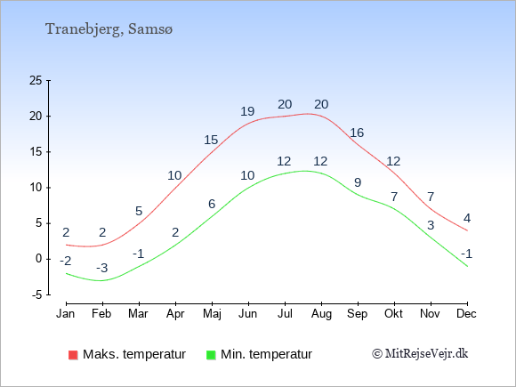 Graferne viser de gennemsnitlige maksimale temperaturer i Tranebjerg og København (typisk når solen står højest på himmelen om eftermiddagen) og de gennemsnitlige minimale temperaturer (typisk den laveste temperatur som måles om natten).