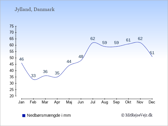 Hvis du vil se, hvordan vejret i Jylland adskiller sig fra vejret i København, kan du sammenligne tallene måned for måned med de tilsvarende tal for København under Jylland: klima & vejr.