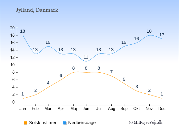 Grafen viser antallet af solskinstimer i Jylland (d.v.s. det gennemsnitlige antal timer pr. dag hvor solen skinner), samt antallet af nedbørsdage (d.v.s. det gennemsnitlige antal dage i en given måned,
