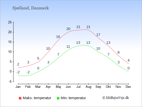 Grafen viser de gennemsnitlige maksimale temperaturer på Sjælland (som oftest den værdi, der er målt midt på dagen) og de gennemsnitlige minimale temperaturer (som oftest den værdi, der er målt midt om natten).