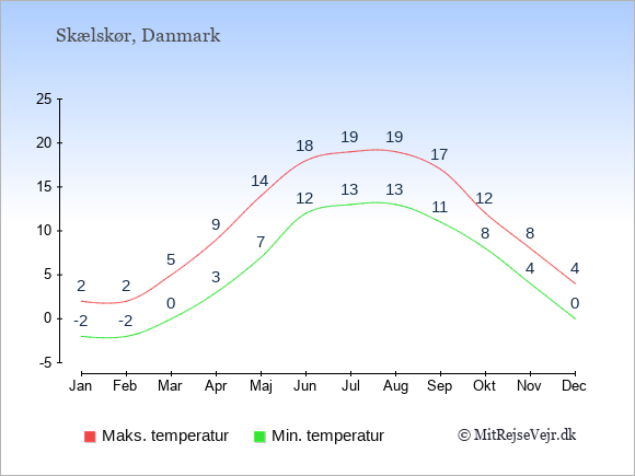 Grafen viser de gennemsnitlige maksimale temperaturer i Skælskør (som oftest den værdi, der er målt midt på dagen) og de gennemsnitlige minimale temperaturer (som oftest den værdi, der er målt midt om natten).