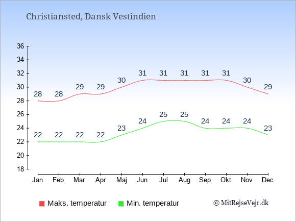 Grafen viser de gennemsnitlige maksimale temperaturer i Christiansted (som oftest den værdi, der er målt midt på dagen) og de gennemsnitlige minimale temperaturer (som oftest den værdi, der er målt midt om natten).