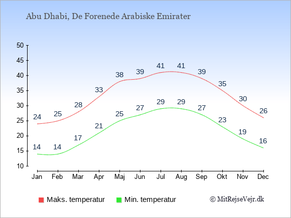 Graferne viser de gennemsnitlige maksimale temperaturer i Abu Dhabi og København (typisk når solen står højest på himmelen om eftermiddagen) og de gennemsnitlige minimale temperaturer (typisk den laveste temperatur som måles om natten).