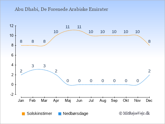 Graferne viser det gennemsnitlige antal solskinstimer i Abu Dhabi pr. dag samt det gennemsnitlige antal dage med nedbør i Abu Dhabi sammenlignet med København.