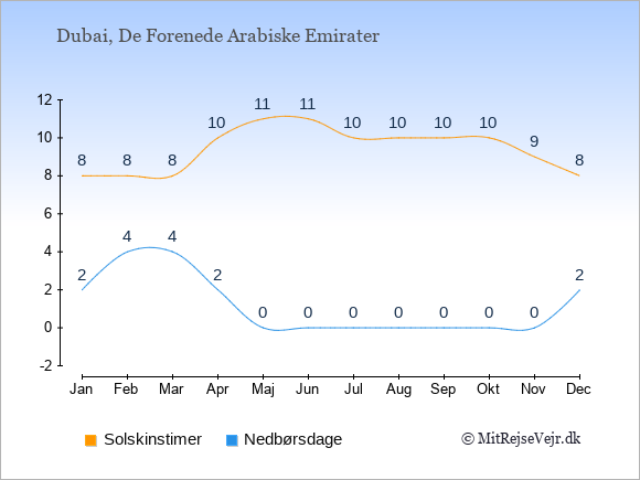 Graferne viser det gennemsnitlige antal solskinstimer i Dubai pr. dag samt det gennemsnitlige antal dage med nedbør i Dubai sammenlignet med København.