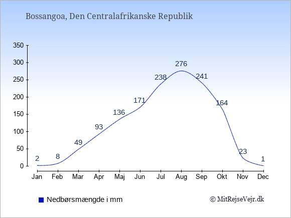 Se klimadata for Bossangoa sammenlignet med klimaet i Danmark.
