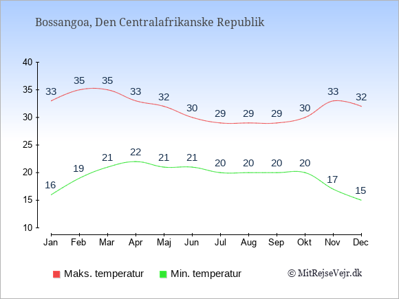 Graferne viser de gennemsnitlige maksimale temperaturer i Bossangoa og København (typisk når solen står højest på himmelen om eftermiddagen) og de gennemsnitlige minimale temperaturer (typisk den laveste temperatur som måles om natten).