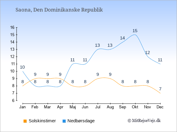 Graferne viser det gennemsnitlige antal solskinstimer på Saona pr. dag samt det gennemsnitlige antal dage med nedbør på Saona sammenlignet med København.