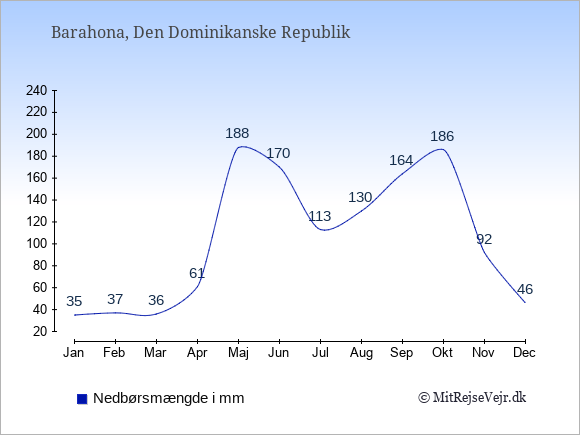 Få et samlet overblik over vejret i Barahona året rundt med temperaturer, vandtemperatur, solskinstimer og nedbør.