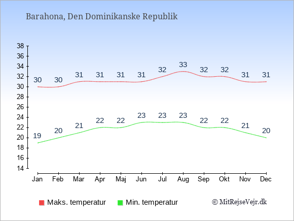 Grafen viser de gennemsnitlige maksimale temperaturer i Barahona (som oftest den værdi, der er målt midt på dagen) og de gennemsnitlige minimale temperaturer (som oftest den værdi, der er målt midt om natten).