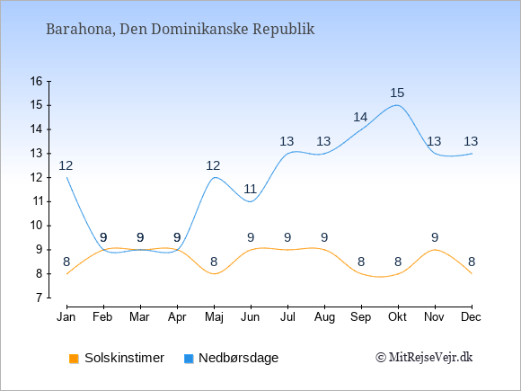 Grafen viser antallet af solskinstimer i Barahona (d.v.s. det gennemsnitlige antal timer pr. dag hvor solen skinner), samt antallet af nedbørsdage (d.v.s. det gennemsnitlige antal dage i en given måned,