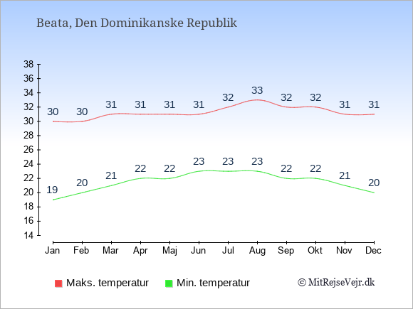 og ned til ca. 23 grader om natten. Da der er tale om gennemsnitsværdier, vil der i løbet af en kalendermåned selvfølgelig også være dage og nætter hvor det er både varmere og koldere end de gennemsnitlige værdier.