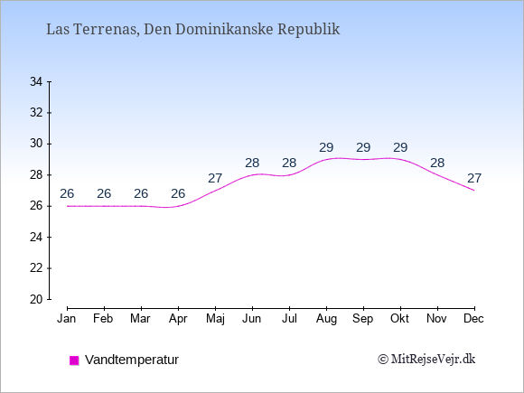 Grafen viser de gennemsnitlige maksimale temperaturer i Las Terrenas (som oftest den værdi, der er målt midt på dagen) og de gennemsnitlige minimale temperaturer (som oftest den værdi, der er målt midt om natten).