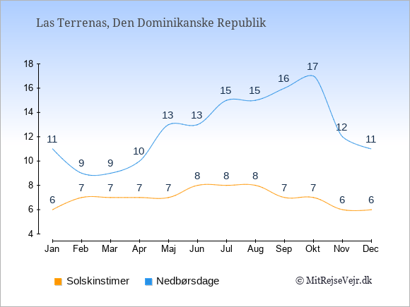 Grafen viser antallet af solskinstimer i Las Terrenas (d.v.s. det gennemsnitlige antal timer pr. dag hvor solen skinner), samt antallet af nedbørsdage (d.v.s. det gennemsnitlige antal dage i en given måned,