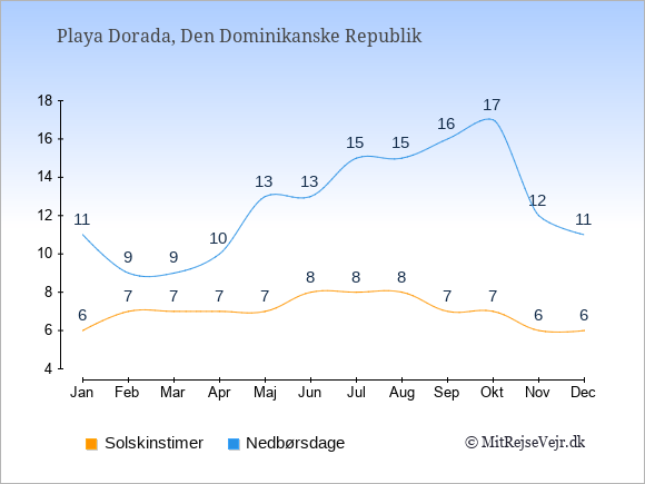Grafen viser antallet af solskinstimer i Playa Dorada (d.v.s. det gennemsnitlige antal timer pr. dag hvor solen skinner), samt antallet af nedbørsdage (d.v.s. det gennemsnitlige antal dage i en given måned,