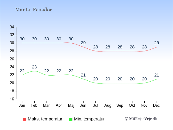 Grafen viser de gennemsnitlige maksimale temperaturer i Manta (som oftest den værdi, der er målt midt på dagen) og de gennemsnitlige minimale temperaturer (som oftest den værdi, der er målt midt om natten).