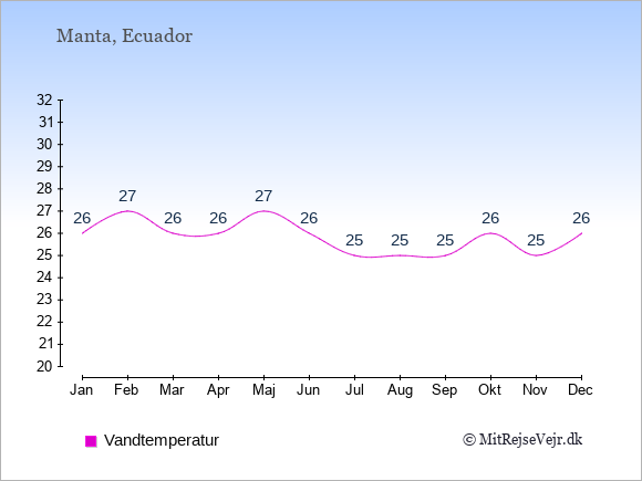 Hvis du vil se, hvordan vejret i Manta adskiller sig fra vejret derhjemme, kan du sammenligne tallene måned for måned med de tilsvarende tal for Danmark under Manta: klima & vejr.
