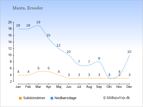 Grafen viser antallet af solskinstimer i Manta (d.v.s. det gennemsnitlige antal timer pr. dag hvor solen skinner), samt antallet af nedbørsdage (d.v.s. det gennemsnitlige antal dage i en given måned,