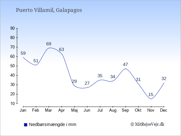 Vejret i Puerto Villamil er som regel bedst i de måneder, hvor der er mange solskinstimer og få nedbørsdage.