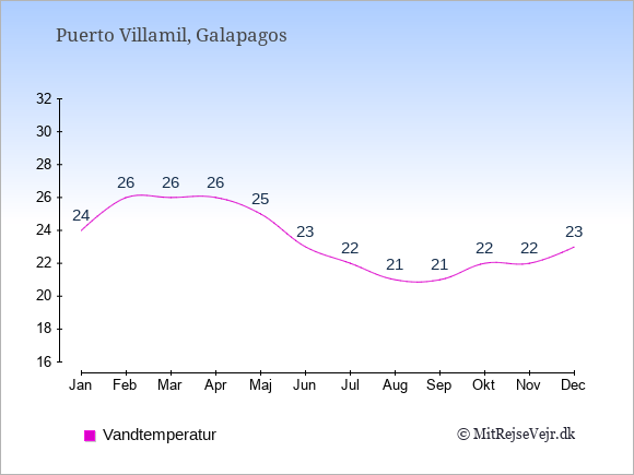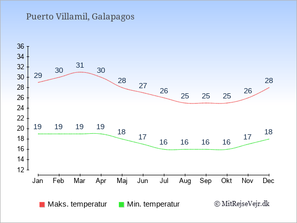 Grafen viser de gennemsnitlige maksimale temperaturer i Puerto Villamil (som oftest den værdi, der er målt midt på dagen) og de gennemsnitlige minimale temperaturer (som oftest den værdi, der er målt midt om natten).