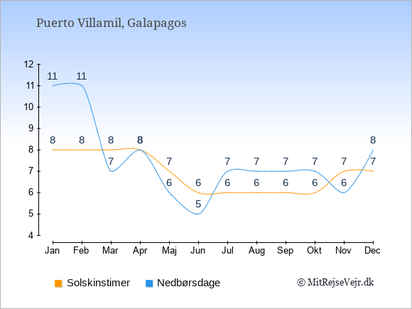 Grafen viser antallet af solskinstimer i Puerto Villamil (d.v.s. det gennemsnitlige antal timer pr. dag hvor solen skinner), samt antallet af nedbørsdage (d.v.s. det gennemsnitlige antal dage i en given måned,