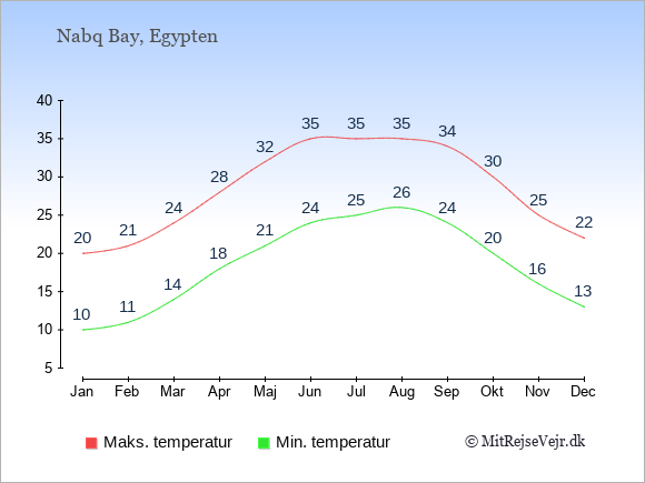 Graferne viser de gennemsnitlige maksimale temperaturer i Nabq Bay og København (typisk når solen står højest på himmelen om eftermiddagen) og de gennemsnitlige minimale temperaturer (typisk den laveste temperatur som måles om natten).
