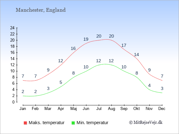 Graferne viser de gennemsnitlige maksimale temperaturer i Manchester og København (typisk når solen står højest på himmelen om eftermiddagen) og de gennemsnitlige minimale temperaturer (typisk den laveste temperatur som måles om natten).