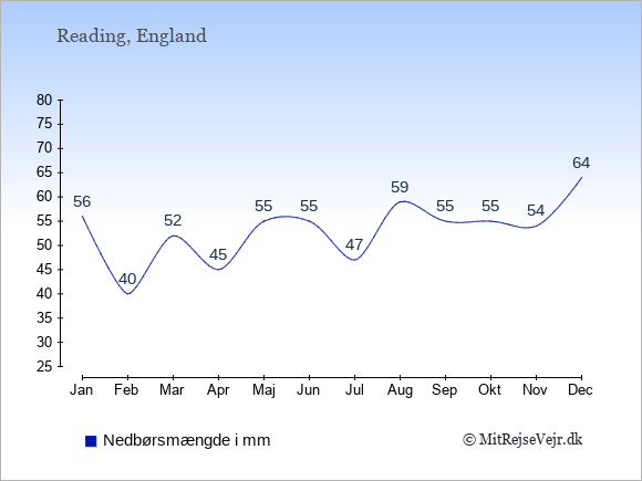 Se klimadata for Reading sammenlignet med klimaet i Danmark.