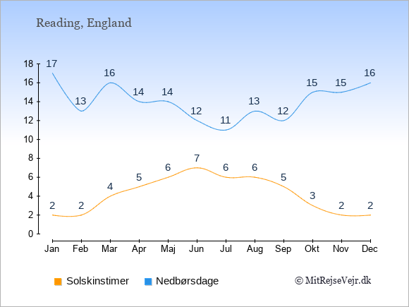 Graferne viser det gennemsnitlige antal solskinstimer i Reading pr. dag samt det gennemsnitlige antal dage med nedbør i Reading sammenlignet med København.
