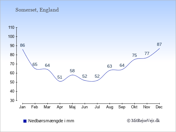 Se klimadata for Somerset sammenlignet med klimaet i Danmark.
