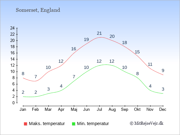 Graferne viser de gennemsnitlige maksimale temperaturer i Somerset og København (typisk når solen står højest på himmelen om eftermiddagen) og de gennemsnitlige minimale temperaturer (typisk den laveste temperatur som måles om natten).