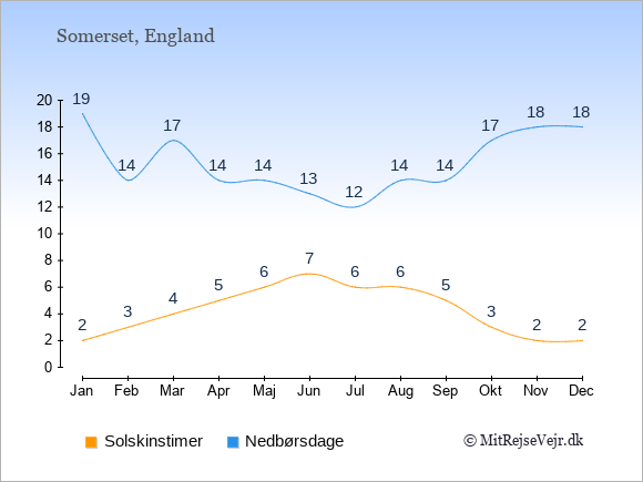 Graferne viser det gennemsnitlige antal solskinstimer i Somerset pr. dag samt det gennemsnitlige antal dage med nedbør i Somerset sammenlignet med København.