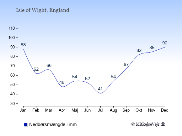 Hvis du vil se, hvordan vejret på Isle of Wight adskiller sig fra vejret derhjemme, kan du sammenligne tallene måned for måned med de tilsvarende tal for Danmark under Isle of Wight: klima & vejr.