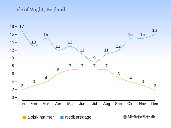 Grafen viser antallet af solskinstimer på Isle of Wight (d.v.s. det gennemsnitlige antal timer pr. dag hvor solen skinner), samt antallet af nedbørsdage (d.v.s. det gennemsnitlige antal dage i en given måned,