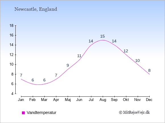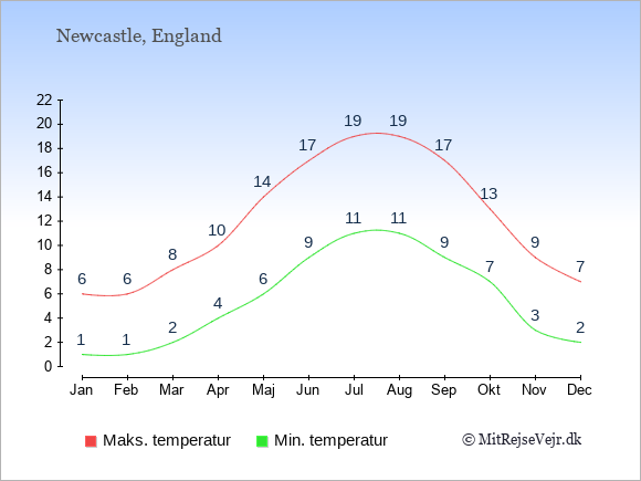 Grafen viser de gennemsnitlige maksimale temperaturer i Newcastle (som oftest den værdi, der er målt midt på dagen) og de gennemsnitlige minimale temperaturer (som oftest den værdi, der er målt midt om natten).