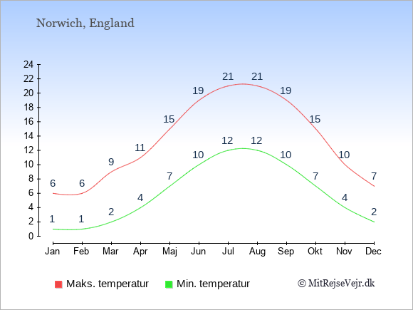 Grafen viser de gennemsnitlige maksimale temperaturer i Norwich (som oftest den værdi, der er målt midt på dagen) og de gennemsnitlige minimale temperaturer (som oftest den værdi, der er målt midt om natten).